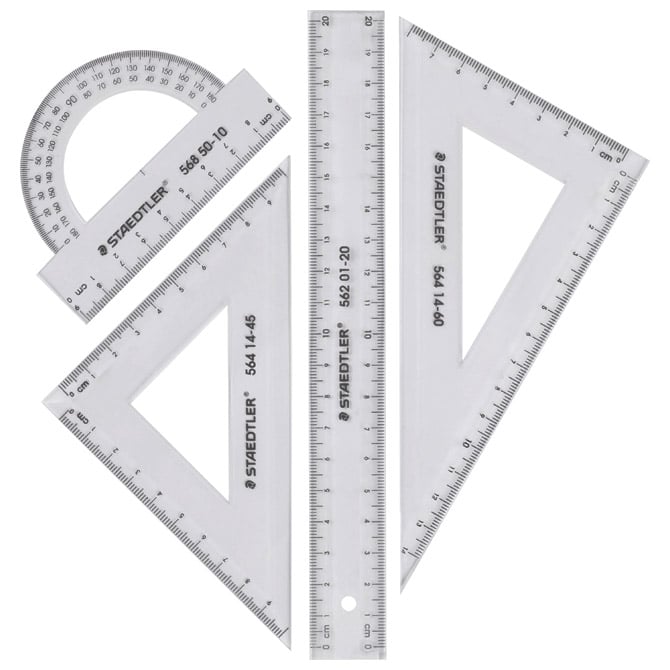 SET GEOMETRIJSKI sadrži: ravnalo 20 cm (sa mjernom skalom za ljevake i dešnjake), trokute (raznostranični i jednakokračni) i kutomjer 180°; PVC; blister Opis: Boja: prozirna Barcode: 4007817027783