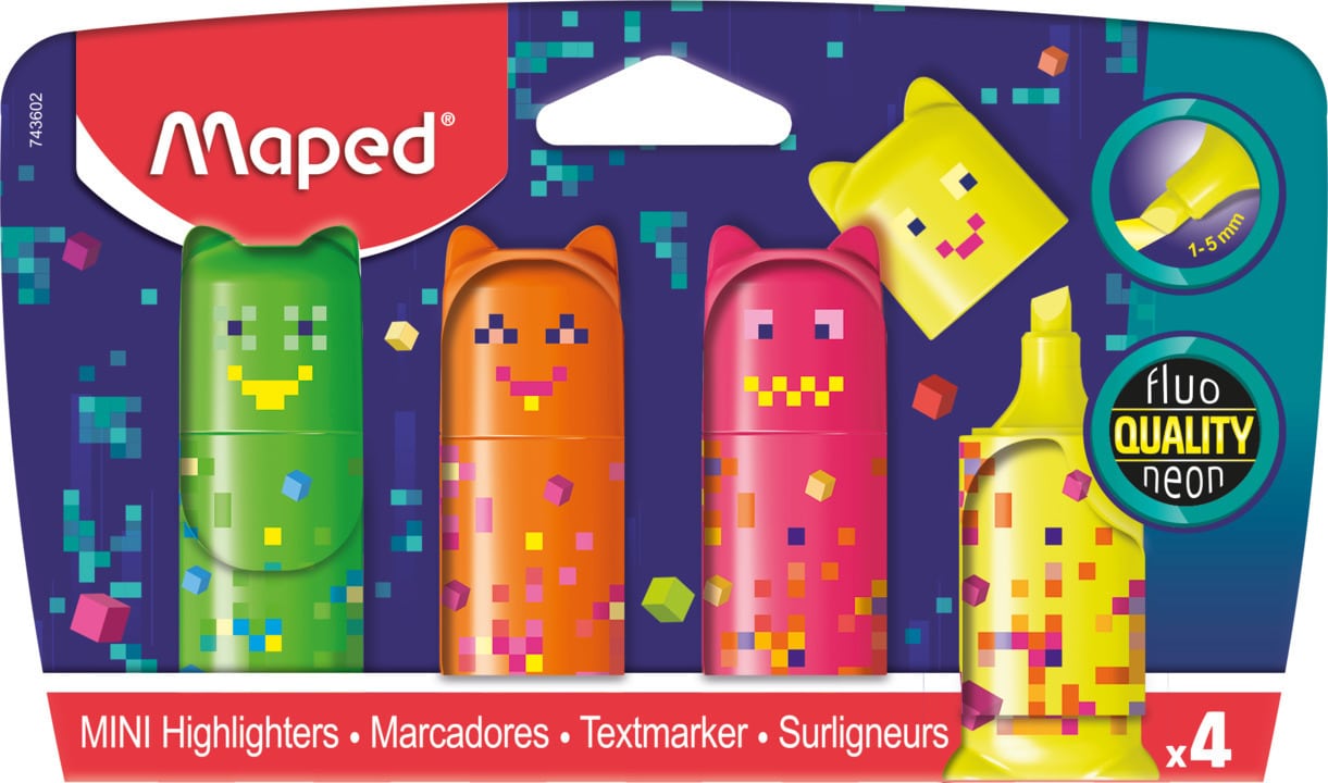 marker za označavanje teksta po svim vrstama papira; mini format; sortirane neon boje; kosi vrh; širina ispisa 1-5 mm