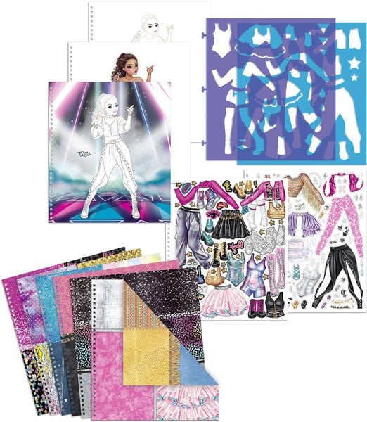 Nova TOP Model bojanka Popstar. 60 stranica s 2 predloška, sjajnim dizajnom tkanine (na papiru) i 2 lista naljepnica. Za potencijalnu hit zabavu slikanja!